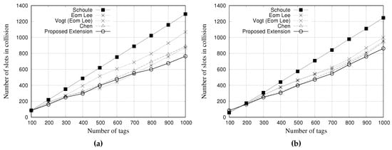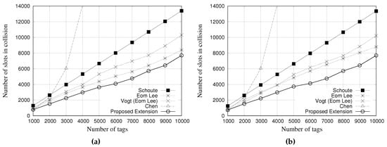 Simulation results for slots in collision when using different estimators with a tag population of 1000 tags. (a) Frame length of 64 slots, and (b) Frame length of 128 slots.