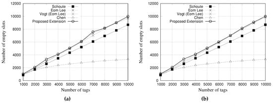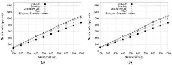 An empty slot occurs when none tag contended for that slot. Figure 10 and Figure 11 present the performance evaluation of multiple estimators regarding the number of empty slots. Figure 10a,b show the results for a tag population of 1000 tags, with frame lengths of 64 and 128 slots, respectively. Figure 11a,b show the results for a tag population of 10,000 tags, with frame lengths of 64 and 128 slots, respectively.