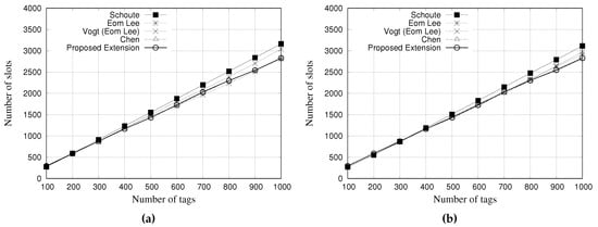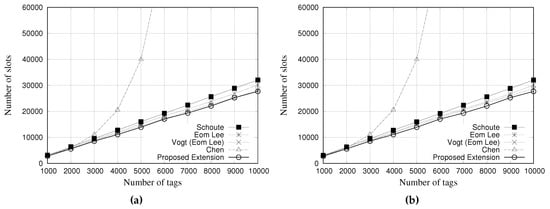 where k represents a coefficient, L the frame length, and i the ith time slot. Considering that there are at least two tags involved in a collision, the coefficient k can be adjusted to be 2 as a minimum limit measure to perform tag estimation. To minimize complex implementations, we considered , which is the same coefficient used in the Schoute method.
