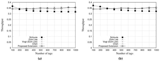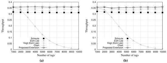 where , and are the average number of successful slots, colliding slots, and empty slots, respectively. Figure 14 and Figure 15 present the simulation results of multiple estimators regarding the throughput. Figure 14a,b show the results for a tag population of 1000 tags, with frame lengths of 64 and 128 slots, respectively. Figure 15a,b show the results for a tag population of 10,000 tags, with frame lengths of 64 and 128 slots, respectively.