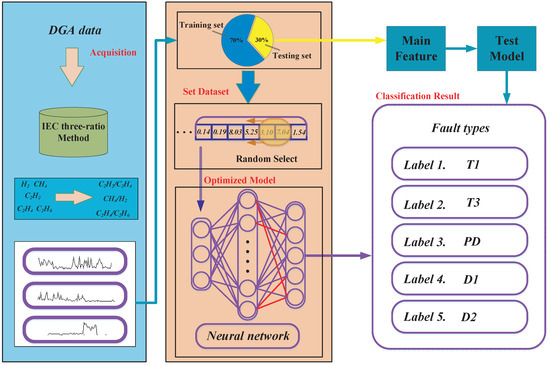 In this paper, power transformer fault diagnosis is mainly divided into four parts: data collection and preprocessing, segmentation of data set, neural network model-training, and comparison between test set output and train set output, as is shown as Figure 3.