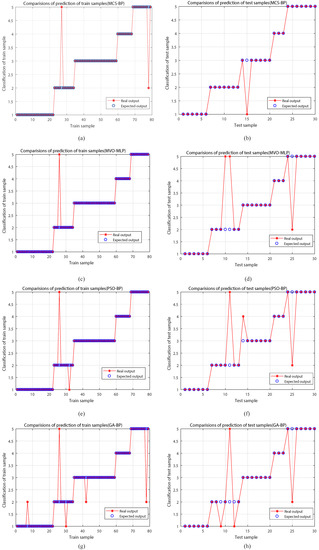 In order to further evaluate the performance of MCS-BP, we plot the output results of different algorithms, such as Figure 4, Figure 4a,c,e,g for the output of training set and the layout of predicted classification results, and Figure 4b,d,f,h for the output of test set classification. Its test set classification effect is not ideal; however, the MCS-BP (a), (b) shows a good recognition rate, and (b) shows that only the third fault type judgment is an error.