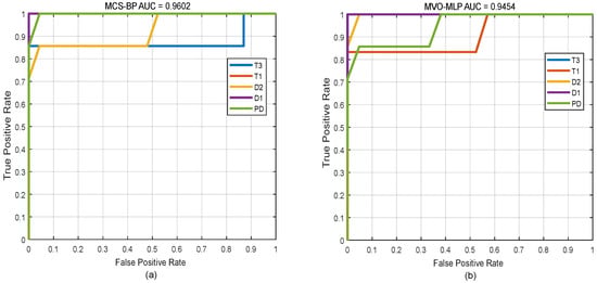 In addition, to clarify the optimization effect of MCS on BP during the iteration process, we consider the variation of the fitness (error) of the MCS, as shown in Figure 5. From generation 1 to generation 50, the fitness value of MCS in the process of optimizing neural network decreases rapidly in generations 1 to 4, which shows that the efficiency of global optimization and local optimization of MCS is very high. Then, it falls into a local extremum in generation 18 or so. However, after a period of iteration, it jumps out of a local extremum point and continues to search for optimization. In addition, we completed the Receiver Operating Characteristic (ROC) Curve, which is shown in Figure 6, and obtain the value area under the curve (AUC). Both of them can prove that our model has great performance of classification for power transformers. For Figure 6a, we can see that each fault class can be classified well.
