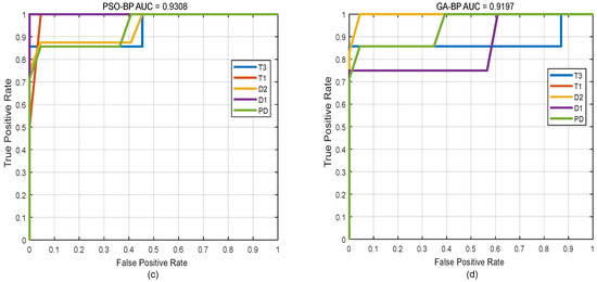 The curve of ROC-AUC of different models. (a–d) represent the receiver operating characteristic curve with AUC for MCS-BP, MVO-MLP, PSO-BP and GA-BP, respectively.