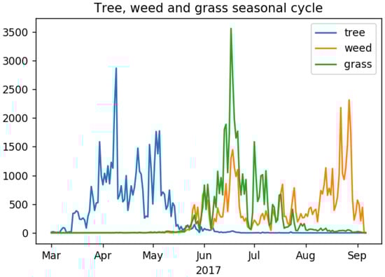 We observe three very different seasons for tree, grass and weed pollen in the pollen observation data (Figure 1). Tree pollen count starts to rise in March, peaks in early April, then decreases through May. Grass and weed pollen count increase dramatically in June, with weed pollen having a second peak later in August (Figure 1). These seasons are in agreement with information on the ‘Pollen Calendar’ produced by the National Pollen and Aerobiology Research Unit [] and other studies of pollen allergies [].