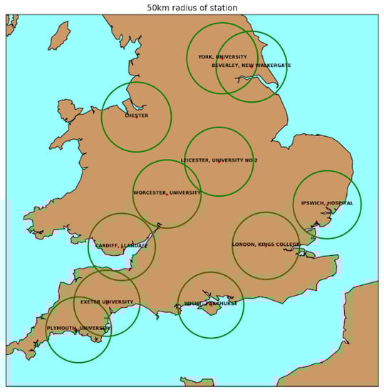 UK pollen data for the same period was collected from the network of pollen monitoring stations [] run by the UK Met Office in collaboration with the National Pollen and Aerobiology Research Unit (NPARU) [] based at the University of Worcester. The locations of the 11 stations used in this study are shown in Figure 3.