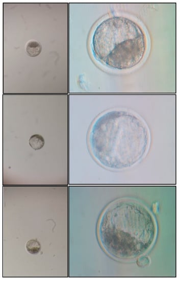 There are some differences between embryos derived from IVP or MOET. The embryos produced in vivo are round, brownish, with plasmatic membranes of the blastocysts close to the zona pellucida, and the inner cell mass (ICM) is surrounded by small intercellular spaces [7,8]. The embryos produced in vitro are generally darker (this has been associated with a higher accumulation of lipid or lipid-like granules in the cytoplasm due to the use of serum in the culture medium) [9]. Blastomeres of in vitro embryos appear more swollen, the perivitelline space is smaller at all pre-compaction stages [9], have a decreased cell count [10], and an increased number of vacuoles in comparison to those produced in vivo [11,12].