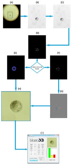 Using MatLab®, it was possible to perform automatized analysis without an embryologist’s intervention. For standardization, the software first performed image import (BMP or JPG), conversion to greyscale (8-bit grayscale), resolution and proportion adjustment (640 × 480 pixels was chosen as the default resolution because it is the lowest standard and provides sufficient information for interpretation), then intensity adjustment (1% of all information becomes saturated between light and dark pixels) [41,42].