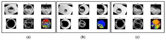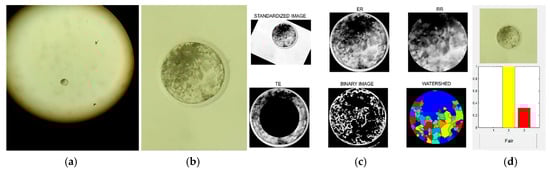 From photographs of oocytes and embryos at the four-cells stage, Manna et al. [18] used techniques based on (1) segmentation (selection of the correct region of interest in the image) and pre-processing for reducing artefacts due to noise, blur, or illumination conditions; (2) feature extraction (usually dependent on numerical descriptors) that compactly represent the starting image (such as local binary patterns or LBP) [18,19,31]; and (3) definition of a classification system in which the classifier is trained using the data stored in the knowledge base.