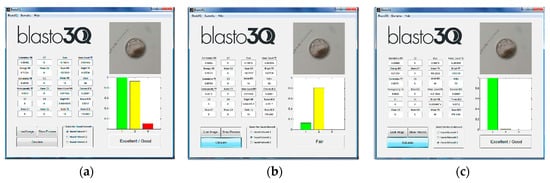 Different graphic interfaces after analyzing the same uploaded blastocyst image from a smartphone source. The mode of the results graded the embryo as (a,c) “excellent/good”, although (b) one Artificial Neural Network (ANN) produced an alternative result (“fair”).