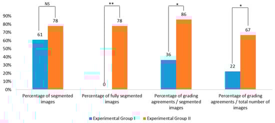 Results of segmentation and grading agreement (related to the grading image produced by control group) of experimental groups I and II (Dataset 1). Fisher Exact Test: NS: p = 0.471), ** p < 0.001, and * p < 0.02.