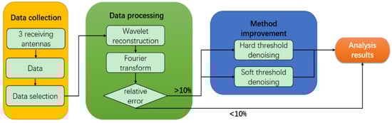 Figure 1 depicts the process of the proposed system. The first part is data acquisition, which involves collecting signal data through three receiving antennas. These data can be transmitted or stored locally in real time, and then the characteristics of the data are selected to find the most suitable raw data for processing (detailed in Section 3.1). The second part is data processing. This part mainly involves preliminary analysis of the collected data to determine whether the results meet the requirements. When the relative error between the frequency after data processing and the reference frequency is more than 10%, the third stage is required; otherwise, this stage is skipped. Finally, the fourth stage involves improving and preserving the results.