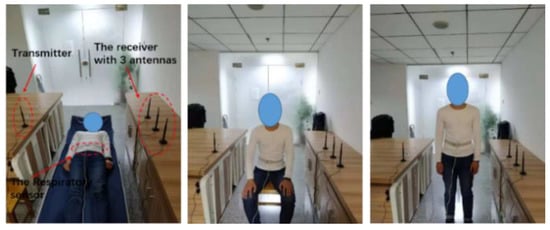 Figure 2 shows the device and the experimental environment used for obtaining wireless data. We mainly collected three kinds of breathing data from the subjects: lying down, sitting, and standing. As shown in Figure 2, we implemented the experiment in a large room (5 × 8 m2).