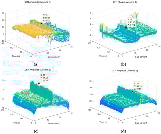 (a) The CFR (channel frequency response) amplitude from antenna 1. (b) The CFR phase from antenna 1. The CFR amplitude from (c) antenna 2 and (d) antenna 3.
