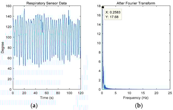 Figure 5 shows the data measured by the respiratory sensor corresponding to this set of data. Because the data obtained by the breathing sensor were stable and experienced little interference, the breathing frequency was obtained by directly performing Fourier transform. The sampling frequency of the breathing sensor was 50 Hz, the sampling time was 2 min, and the total number of samples was 6000. Given this information, correct Fourier transform could be applied. The ordinate in Figure 5a,b shows the degree of undulation of the abdomen rather than the amplitude. As shown in the figure, the frequency was 0.2583 Hz with respiration rate of 15–16 bpm (beat per min). Figure 5b shows the Fourier transform of Figure 5a.
