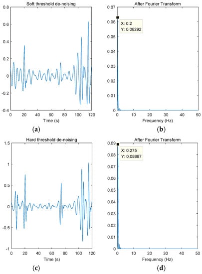 From Figure 7b,d, we can see that the respiratory activity frequency after soft threshold denoising was 0.2 Hz and the respiratory activity frequency after hard threshold denoising was 0.275 Hz. After calculating the relative error, we concluded that the soft threshold denoising relative error was 22.6% and the hard threshold denoising relative error was 6.5%.