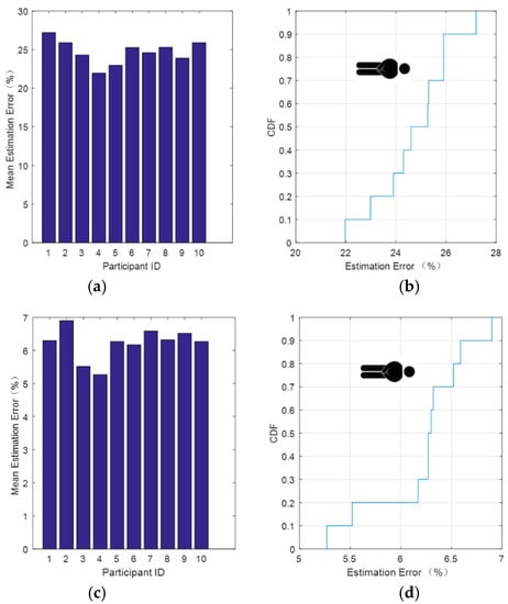 Respiratory signal relative error after data processing for the sitting posture. (a) Average error estimate and (b) CDF of the estimated error after soft threshold denoising. (c) Average error estimate and (d) CDF of the estimated error after hard threshold denoising.
