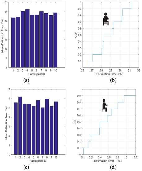 Figure 9 shows the respiratory signal relative error after data processing for the sitting posture. Figure 9b shows that after soft threshold denoising, there was a 70% probability that the relative error would be lower than 30% and a 100% probability that it would be less than 32%. From Figure 9d, we can see that after hard threshold denoising, there was an 80% probability that the relative error would be lower than 5.8% and 100% probability that the relative error would be less than 6.2%. This method is also applicable to each group of data as mentioned earlier.