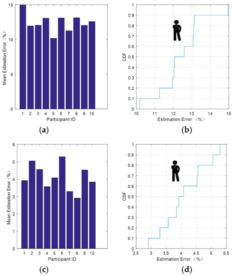 Figure 10 depicts the respiratory signal relative error after data processing for the standing position. It can be seen from Figure 10b that after soft threshold denoising, there was a 60% probability that the relative error would be lower than 13% and a 100% probability that it would be less than 14%. From Figure 10d, after hard threshold denoising, there was an 80% probability that the relative error would be lower than 5% and 100% probability that it would be less than 5.5%. This method is also applicable to each group of data and behaves same as mentioned above.