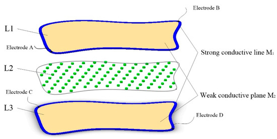 In this paper, two conductive materials with different conductivities were used to construct the conductive plane, as shown in Figure 1. The two conductive materials should have good flexibility, and the conductivity of one is much greater than that of the other one. A flexible weak conductive layer was made of the material with low conductivity, and a special designed strong conductive line made of the material with high conductivity was arranged along the edge of the weak conductive layer. Thus, the conductive plane is constructed.