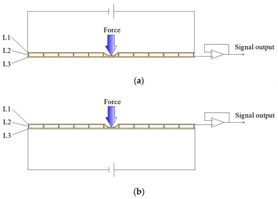 The potential of any point in M2 can be detected as followed. A DC bias voltage is first applied between the two electrodes of the upper Layer L1, and a uniform electric field will be generated in M2 of layer L1. If an external force is applied to the surface of the sensor, the upper layer L1 will be deformed, penetrating through the middle layer L2, and making contact with the lower layer L3 at the contact point, as shown in Figure 2. Then, the potential of the lower layer L3 is equal to that at the contact point of the upper layer L1, on the condition that the lower layer L3 has access to an operational amplifier with infinite input impedance in theory. Similarly, if a DC bias voltage is applied between the two electrodes of the lower layer L3, it is also easy to obtain the potential of the contact point by means that the upper layer L1 is accessed by the operational amplifier. The uniform electric field in the two conductive layers L1 and L3 can be generated alternately and perpendicular in direction. This makes it possible to obtain the X and Y coordinates of any point in M2.