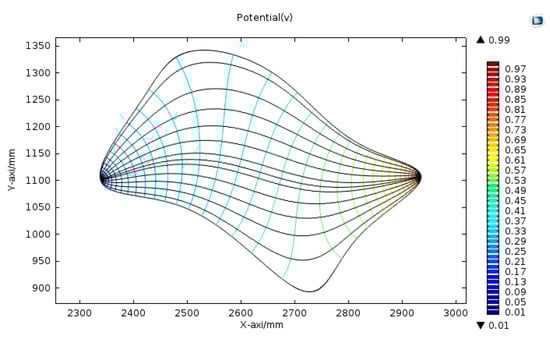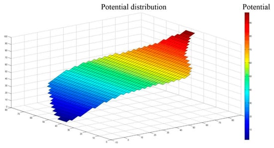 Setting the boundary potential distribution to , where is a positive constant, represents the magnitude of the change in the potential gradient in the uniform electric field. The larger the , the more obvious the potential change. MATLAB was used to solve the Laplace equation under the boundary conditions (we set the boundary potential distribution to ), and the potential distribution in the conductive plane is shown in Figure 5.