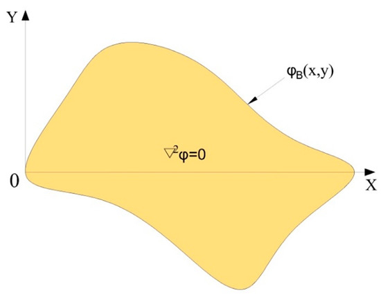 First, two electrodes were assumed to be arranged at both sides of an irregularly shaped homogeneous conductive plane consisting of only one material. If a DC bias voltage is applied between two electrodes, a constant current field will be formed in the conductive plane. Since the interior of the homogeneous conductive plane is a passive region, the potential distribution in the conductive plane should satisfy the Laplace equation: