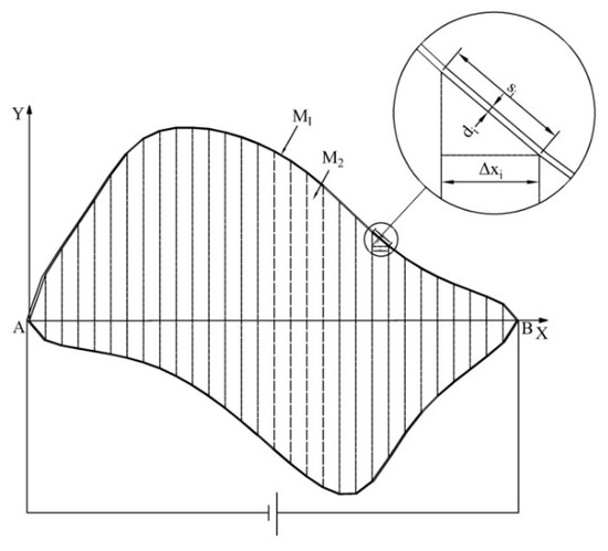 The irregular plane shown in Figure 3 was used as an example to construct the boundary potential. First, the boundary curve of the irregular plane was discretized to a polygon model. Then, the polygon model was built in a rectangular coordinate system. Finally, the two conductive materials, M1 and M2, were used to construct the polygon conductive plane, as shown in Figure 6.