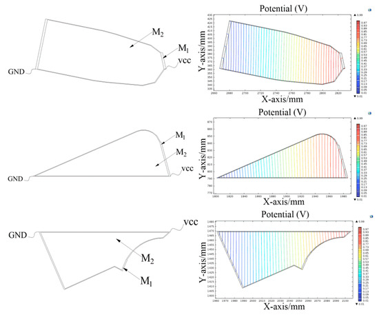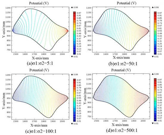 Under the same conditions, the ratio of the conductivity of M1 to M2 will affect the potential distribution in the conductive plane. COMSOL Multiphysics was used to simulate the conductive plane with different ratio of the conductivity of M1 to M2. The potential distribution of the conductive plane is shown in Figure 9.