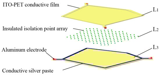 - Lower layer L3: This was similar to the upper layer L1 and was also composed of the ITO-PET conductive film and the conductive silver paste. However, the shape of the strong conductive line printed by the conductive silver paste was different to that of the upper layer L1.