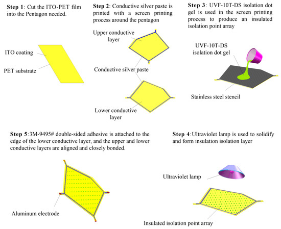 The upper layer L1 and the lower layer L3 were pentagonal conductive layers consisting of an ITO-PET conductive film with lower conductivity and a pentagonal flexible circuit printed with a conductive silver paste with higher conductivity at the edges. Metal electrodes were arranged at both ends of the flexible circuit. The middle layer L2 was an isolating layer consisting of an evenly distributed insulated isolated point array. As shown in Figure 13, the sensor was made as follows: