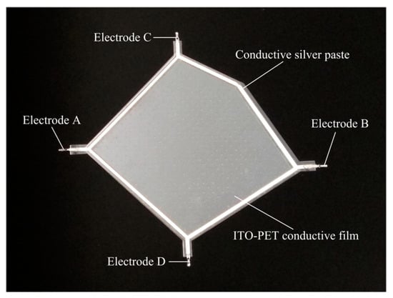 - Upper layer L1: An ITO-PET conductive film with sheet resistance of 100 Ω/cm2 and a thickness of 0.175 mm (where the thickness of the ITO film was 70 nm) was cut into a pentagon. A conductive silver paste with a conductivity of about 2.4 × 107 S/m was printed using a screen printing process around the pentagon sides onto ITO-PET conductive film. A pair of aluminum electrodes were fitted at both corners of the pentagon.