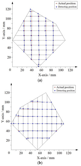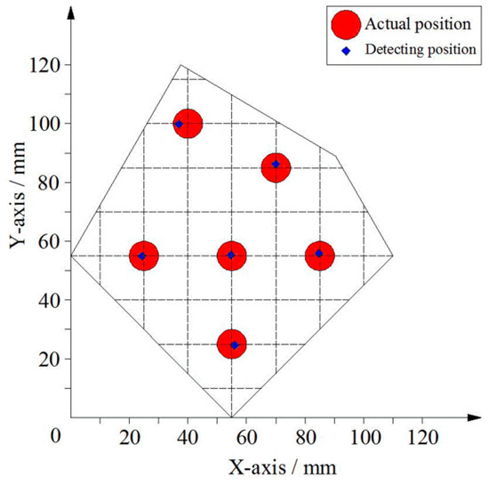 When the contact area was not a point, but an area, such as a circular area with a radius of 5 mm, six circular areas on the plane were selected as the measuring points. The comparison of the position coordinates of these points with the actual position (the coordinates of the center of the center) is shown in Figure 17.