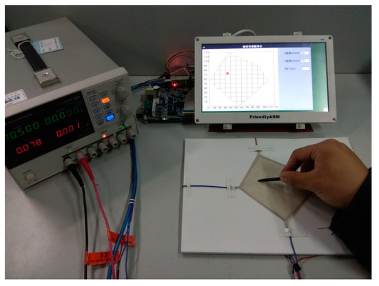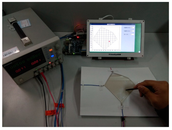 Based on the PIC18F25K80 chip, we built a signal processing circuit of the tactile sensor, which could carry out the switching of the dual DC voltage steady voltage input to the sensor, and the functions of acquisition, amplification, filtering, A/D conversion, and external communication of the output signal. Using the Mini210s hardware system based on the CortexTM-A8 processor and the Qt Creator integrated development environment, the output display module of the tactile sensor was developed, and the dynamic display function of the sensor’s contact position information was realized. The tactile sensor was attached to the plane paperboard and the curved paperboard, respectively, for contact position detection. The experimental devices are shown in Figure 18 and Figure 19.