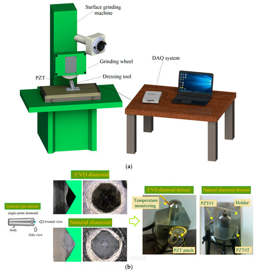 Proposed sensing setup for dressing tool condition monitoring (Part 2): (a) schematic representation of the test bench; and (b) the two types of diamond dressing tools and the two lead zirconate titanate (PZT) transducers for experimental testing; configuration of the dresser body; top and side views of the diamonds. (DAQ: multifunctional data acquisition; CVD: chemical vapor deposition)