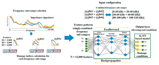 As is well known, the impedance signatures are sensitive to minor changes in the host structure. In addition, to obtain the impedance signatures sensitive to the damage, the measured frequency range should contain those resonant frequencies related to the monitored structure [14]. Therefore, to analyze the results of this study, both damage metrics RMSD and CCDM were calculated for several frequency bands from 0 to 125 kHz. This frequency range was selected due to the sampling rate of the DAQ device used in this research work (i.e., 250 kS/s). The real part of the impedance was considered for this purpose. According to Table 2, six frequency sub-ranges were defined within a wide frequency band of 0–120 kHz, with each frequency sub-range equal to 20 kHz. The choice of the frequency sub-range value was optimally selected for the present application based on experimental impedance signatures and on the values obtained from the damage metrics, as well as following the approaches presented in [7,50]. The sampling rate for damage indices calculation was 10 Hz. In this way, for a given sensor, for a given damage metric and for a given frequency sub-range, the training inputs to the ANN are made of 2000 features for each of the three damage conditions (D1, D2, D3), i.e., they consist of input patterns each containing 6000 features with each feature related to only one of the three damage conditions: D1 or D2 or D3. As two transducers were utilized (PZT#1, PZT#2), two damage metrics were calculated (RMSD, CCDM) and six frequency sub-ranges were considered (0–20 kHz or 20–40kHz or 40–60 kHz or 60–80 kHz or 80–100 kHz or 100–120 kHz), a total of 2 × 2 × 6 = 24 training patterns were constructed for supervised learning of 24 ANN models. In addition, a study was conducted to identify the best ANN architecture. Each ANN model was trained and tested by combining the input patterns of two consecutive frequency sub-ranges, based on [37,40], to yield a combined input pattern containing 12,000 features for each of the three resulting combined frequency sub-ranges: [0–20 kHz + 20–40 kHz], [40–60 kHz + 60–80 kHz], [80–100 kHz + 100–120 kHz] (Table 3). The scope was to find the best frequency sub-range combination capable to provide the reliable monitoring of dressing tool condition. This procedure was adopted following the approach presented in [12]. Furthermore, a schematic representation of the training set construction as well as the ANN structure is shown in Figure 2.