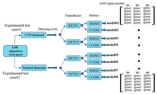 On the other hand, indirect measurement techniques have been developed as innovative approaches for manufacturing process monitoring [6]. In particular, impedance-based structural health monitoring (SHM) has emerged for its easy applicability due to the use of low-cost lead zirconate titanate (PZT) piezoelectric transducers and simple instrumentation requirements [7,8,9]. This approach has been employed for different structural damage detection applications in aerospace and civil engineering by utilizing the electromechanical impedance (EMI) measurement system [10,11,12]. Since this technique has emerged, however, impedance-based diagnosis for grinding and dressing operations is still a rare instance and the number of research publications on the topic is very small. An application to dressing operation monitoring based on the EM impedance method was proposed in Part 1 of this work and the damage level suffered by the tool during the dressing operation was verified through representative damage indices. However, the selection of the most appropriate frequency ranges for the damage indices calculation needs to be carried out through analytical approaches or artificial intelligence paradigms, which was not covered by that work (Part 1).