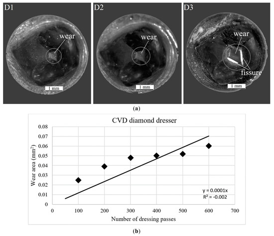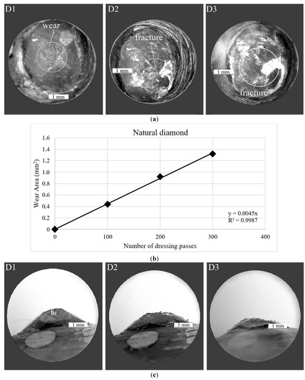 As expected, a clear difference is evidenced when comparing the results obtained when using different dressing tool diamonds. Figure 7 shows microscopic photographs of the natural diamond dressing tool after 100, 200 and 300 dressing passes, respectively, as well as the development of natural diamond dressing tool wear as a function of the number of dressing passes.