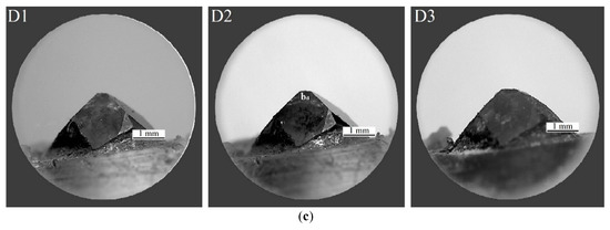 A significant difference of the diamond conditions can be observed as the dressing passes progress, displaying a much lower wear resistance than for the CVD diamond dressing tool. From Figure 7a,c, it can be observed that the condition of the diamond changed significantly as the dressing passes increased. By examining the top and side views of the natural diamond tool, the wear level after 100 dressing passes is already quite evident and severe damage is verified after 200 and 300 dressing passes evidencing excessive wear and tool fractures. In this case, the increase of the contact area between grinding wheel and diamond tool was higher with a significant growth of the width of action, bd, parameter for a constant dressing depth, ad = 40 µm, and a constant dressing feed, fd = 3.45 mm/s.
