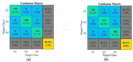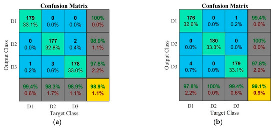 Further comparisons and analyses are illustrated in Figure 5 and Figure 6, where confusion matrices and decision boundary graphics present the best ANN performances for experimental test case 1. Confusion matrices are often used to summarize the performance of a classification model [40]. Accordingly, the results of model#1 and model#3 are presented in Figure 5a,b, respectively. As regards model#1 (Figure 5a), for the D1 damage condition the ANN presented a predictive capability of 100% and a sensitivity of 99.4%. For the D2 damage condition, the predictive capability was 98.9% and the sensitivity was 98.3%, corresponding to the occurrence of false positive diagnostics. For the D3 damage condition, the confusion matrix showed a predictive capability of 97.8% and a sensitivity of 98.9%. The overall accuracy rate of the ANN for model#1 was 98.9%, which is attractive for actual implementation.