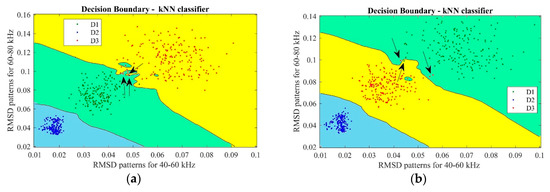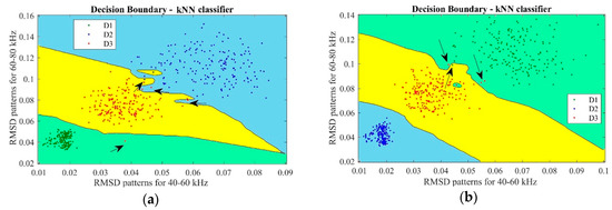 Figure 6 reports the decision boundary graphics based on k-NN classifier for the best models achieved by ANN for the experimental case 1, according to Table 4. Boundary regions graphic is a visual way to analyze the results of the k-NN procedure; this approach is based on an over fitting process, according to [52]. In this kind of graph, the location of each point refers to the real damage condition, while its color shows the classification performed by the k-NN based on successful training of the ANN. In Figure 6, the arrows indicate the features that have not been classified correctly. Since model#1 and model#3 presented good results, the classification performance is very high with only a small number of features misclassified in the k-NN procedure. In Figure 6a (model#1), it can be observed that some features belonging to the D3 damage class were classified as D1 and D2. On the other hand, only one feature belonging to the D2 damage class was classified as D3. In Figure 6b (model#3), it is possible to see that one feature belonging to the D1 damage class was classified as D3, as well as some features belonging to D3 were classified as D2. This result again agrees with the literature, since most of the damage features erroneously classified occurred in regions close to the borders, as reported in [37] where the authors did not consider them as serious errors because these boundaries can be difficult to determine.