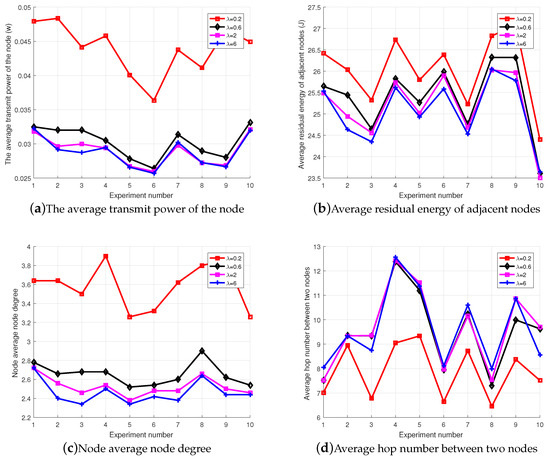 For , the influence of on the network topology performance was considered in terms of the average transmit power, the average node degree between nodes, the average residual energy of the adjacent node and the average hop number of the shortest path between nodes.