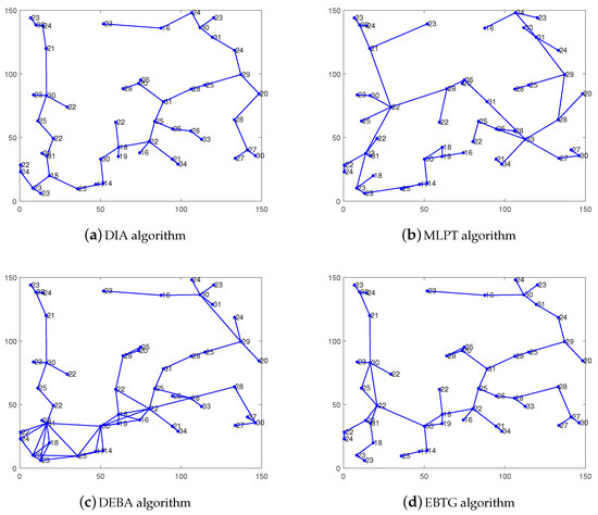 Figure 4 shows the network topology diagram of the four algorithms, i.e., DIA, MLPT, DEBA and EBTG. It can be seen that the network topology built by the DIA algorithm has a large load and low residual energy (the nodes are marked out). The DEBA algorithm has a higher node degree and more redundant nodes, which lead to faster energy consumption. Compared to the other two algorithms, the MLPT and EBTG algorithms have lower node degrees and fewer redundant nodes. The general theory of network topology shows that the EBTG algorithm has moderate nodes and redundant nodes; therefore, its network connectivity and robustness are better than those of the other three algorithms, which can efficiently balance the load between nodes to prolong network lifetime.
