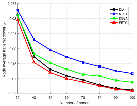 Figure 5 is a comparison diagram of the transmission power between nodes. It can be observed in the figure that the transmission power of a node decreases as the number of nodes increases. The EBTG algorithm’s node average transmit power is lower than those of DIA, MLPT and DEBA algorithms, which can ensure that the EBTG algorithm can establish network topology connections with lower power, which is conducive to extending the network lifetime. In the design stage of EBTG algorithm, we considered the influence of node transmit power on the operation of the algorithm. Therefore, the simulation results show that the node transmit power performance is optimal.