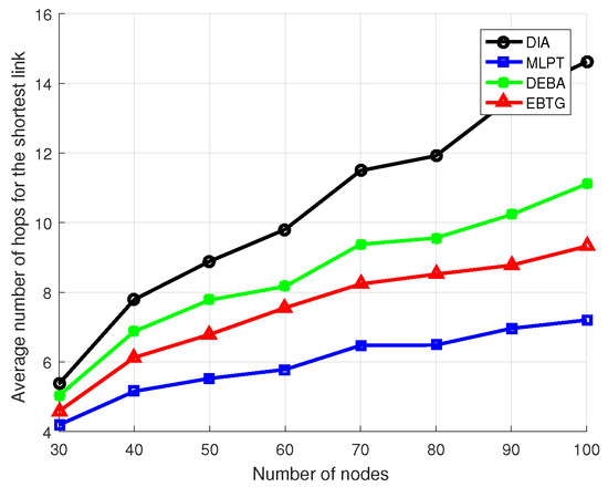 Figure 6 shows the hop count comparison of the shortest link between nodes. The average hop count of the EBTG algorithm is higher than that of the MLPT algorithm, but it is still lower than the DIA and DEBA algorithms. The MLPT algorithm has higher node transmit power and greater communication coverage, and thus its average link hop count is lower. Since the EBTG algorithm operates at lower power and the communication radius is smaller, the average hop count of the link increases. However, the EBTG algorithm still obtains fewer link hops than the DIA and DEBA algorithms when the transmit power is lower than the DIA algorithm.