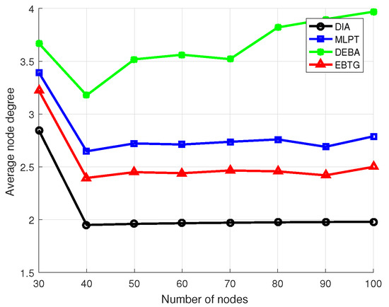 Figure 7 shows a comparison of node degrees for the four algorithms. Because nodes with more energy remaining in the EBTG algorithm are more active in node communication, to obtain a more balanced load to prolong the life cycle of the network, the node degree is higher than that of the DIA algorithm but lower than that of the DEBA and MLPT algorithms. The moderate node degree of the EBTG algorithm does not occupy too much of the energy resources and obtains relatively good connectivity and robustness, while having fewer redundant nodes can achieve better energy efficiency, improve channel multiplexing and reduce interference. Since the influence of network node degree on network performance, such as robustness. is obvious, we considered the influence of node degree when designing the algorithm’s utility function. It can be seen in the figure that the node degree of the EBTG algorithm performs better than those of the other algorithms, which do not effectively consider the influence of node degrees.