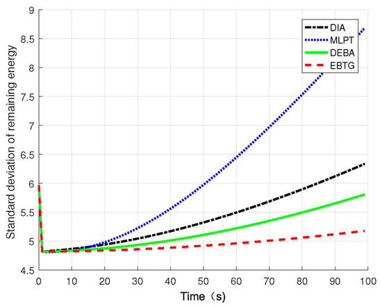 in the simulation to compare the remaining energy balance. It can be seen that the variance of the EBTG algorithm changes slowly. In the network topology constructed by the DIA, MLPT, and DEBA algorithms, the load of some nodes is too high, which affects the network lifetime. If these heavily loaded nodes die prematurely, they will also have a greater impact on the connectivity and robustness of the network. The DIA algorithm overemphasizes that reducing the node transmit power makes the network energy consumption uneven; the MLPT algorithm does not consider the node’s residual energy, resulting in poor performance of its energy balance; the DEBA algorithm focuses on energy balance, while ignoring the energy efficiency, which leads to the growth of the residual energy standard deviation; the rising trend of the EBTG algorithm is the most gradual. The EBTG algorithm not only considers the remaining energy of the node but also transfers the data forwarding task to nodes with more residual energy, effectively balancing the load of the entire network and improving energy efficiency.