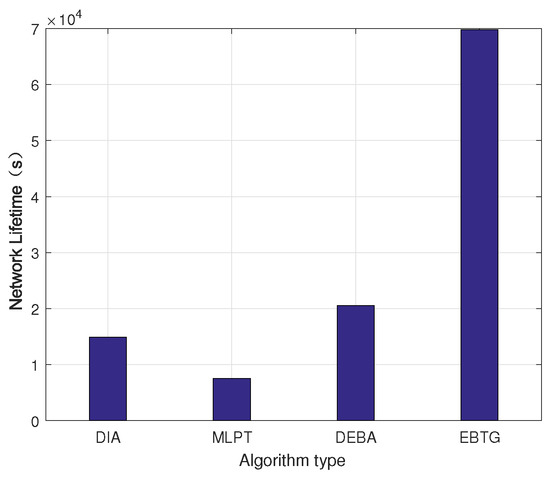 Figure 9 is a network lifetime comparison chart. Because topology control is mainly concerned with energy, prolonging the network life cycle is an important index for evaluating the topology control algorithm. The graph shows that the network lifetime of the EBTG algorithm is the longest because the EBTG algorithm reduces the transmit power of the node, expertly balances the load between nodes and improves the energy efficiency; therefore, its network lifetime is much higher than those of the networks constructed using the DIA, MLPT and DEBA algorithms.
