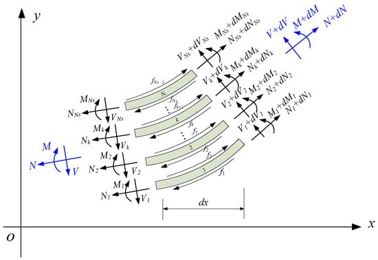 We assume that the cross-section of a laminated beam is divided into subsections under the action of interlayer slip, as shown in Figure 2, wherein the internal forces acting on the kth subsection include the axial force , bending moment and shear force . The upper and lower contact layers of the segment are subjected to interlayer frictional forces acting in opposite directions, denoted as . Neglecting the influence of the rotational moment of inertia, the bending moment balance equation for each subsection can be expressed as follows: