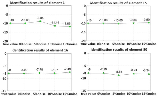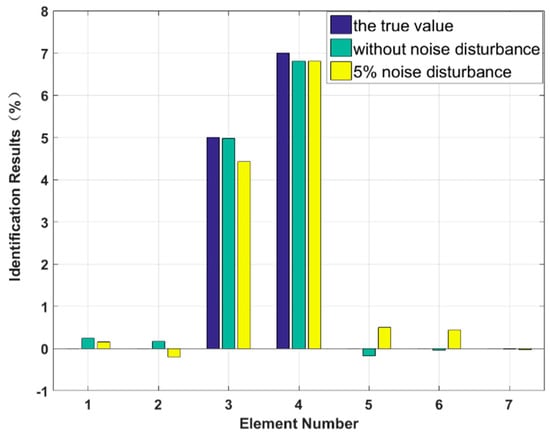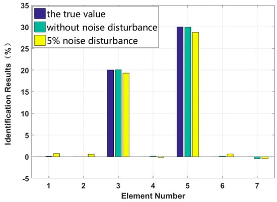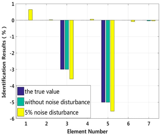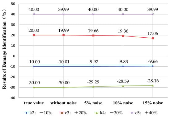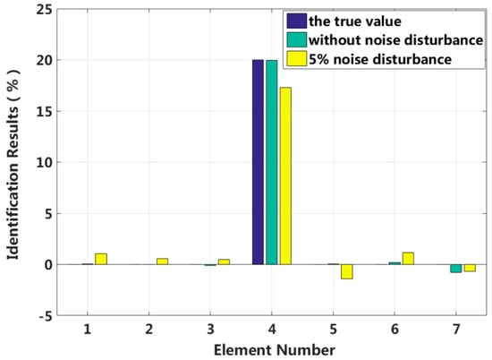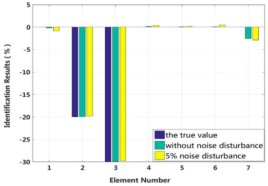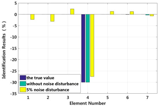 It is assumed that four instances of damage occur to the second, third, fourth and fifth elements with parameters , , and perturbed by −10%, +20%, −30% and +40%, respectively. There are four different artificial measurement noise disturbance levels. The identification results are shown in Figure 17. The results indicate that the eigenpair sensitivity method can accurately identify the parameter damage degree when there is no measurement noise. As the artificial measurement noise level gradually increases, the error of the parameter damage recognition result also gradually increases. When the noise level of 15% is reached, the errors of the parameter damage identification results are within 3%. Thus, the proposed method is robust to noise disturbances in high-damage cases.